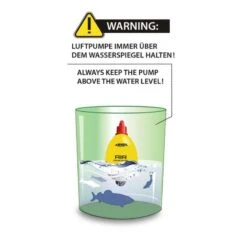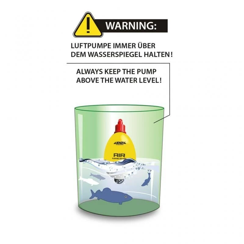 Drijvende beluchtingspomp Deze drijvende, compacte en robuuste beluchtingspomp kan gewoon in het water worden “gegooid”. Dit betekent dat het in een gesloten verpakking kan worden gebruikt, bijvoorbeeld tijdens het rijden, en voorkomt dat er water uitspat. Bovendien kan hij ook normaal worden gebruikt met een slang. Vooral in de winter kan worden voorkomen dat het water bevriest (door de pomp in het water te verplaatsen). Levering inclusief slang en uitlaatsteen. 1 batterij (type AA (1,5 V),