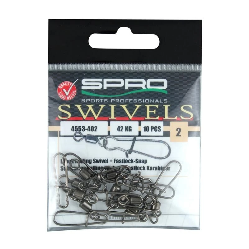 De rolling swivel met fastlock snap van Spro behoort tot de grote familie van een uitgebreid wartel assortiment. Spro heeft een groot aantal modellen, maten en trekkrachten. De Rolling Swivel met Fastlock Snap is bruikbaar in elke visserij en situatie. Deze is gebruiksvriendelijk als verbinding tussen hooflijn en onderlijn of hoofdlijn en kunstaas en vele andere situaties. Inhoud verpakking: 10stuks. Verkrijgbaar in de maten:Â