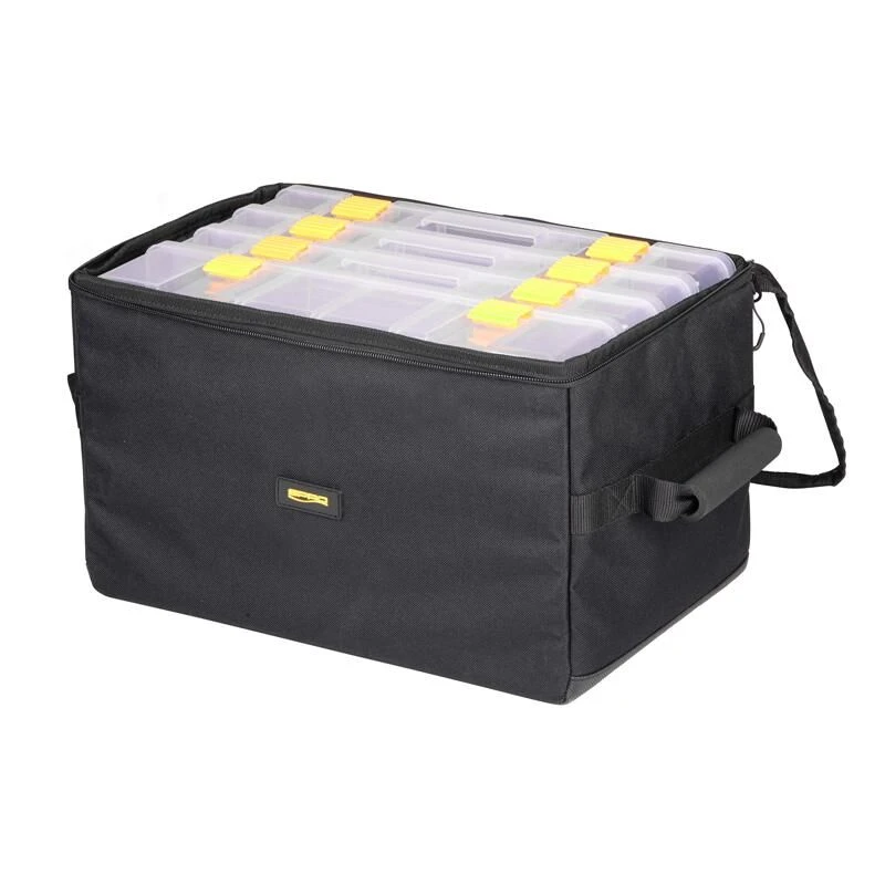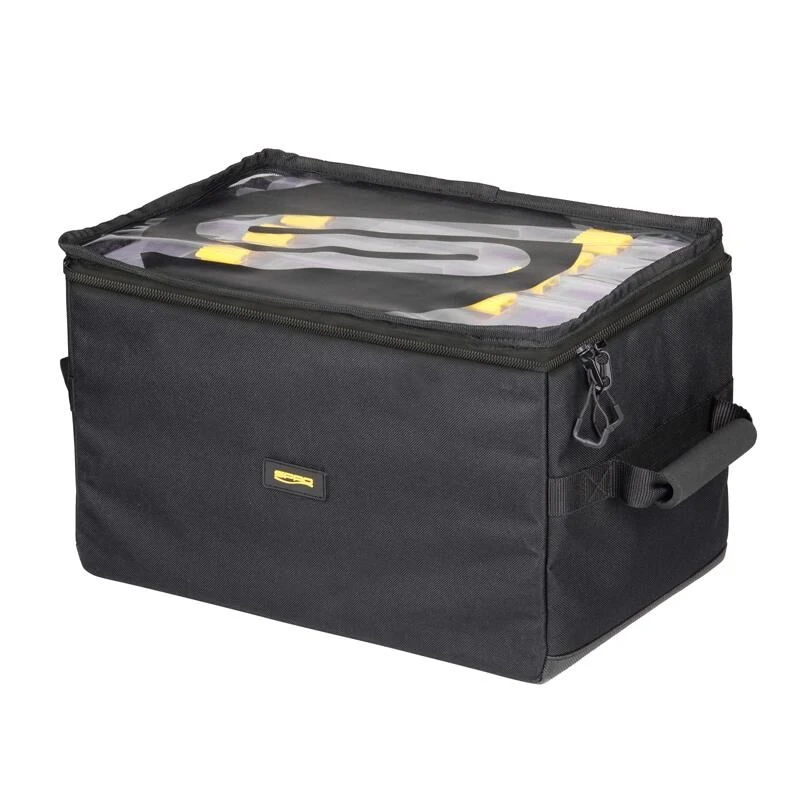 Tacklebox-tas met 3 platte tackleboxen en 1 hoge voor groter kunstaas en accessoires. Voorzien van handgrepen aan de zijkant voor handmatig transport. Compact en makkelijk op te bergen in een kast of boot. Dankzij de transparante, afritsbare deksel kun je eenvoudig de inhoud van de boxen zien en houdt het materiaal droog. De bodem is extra duurzaam en waterdicht.
